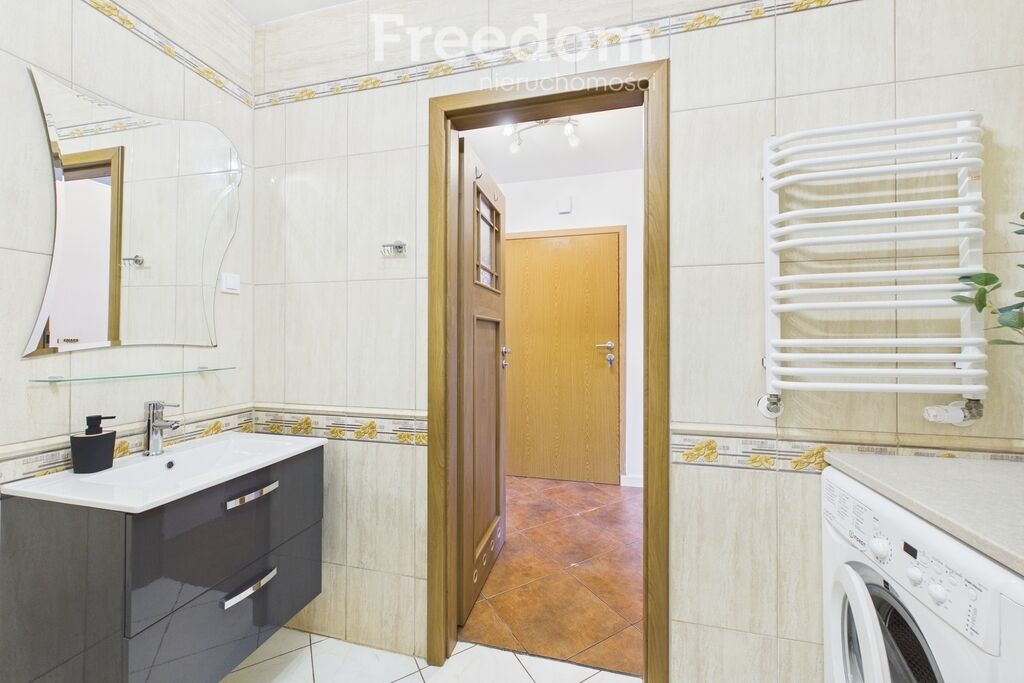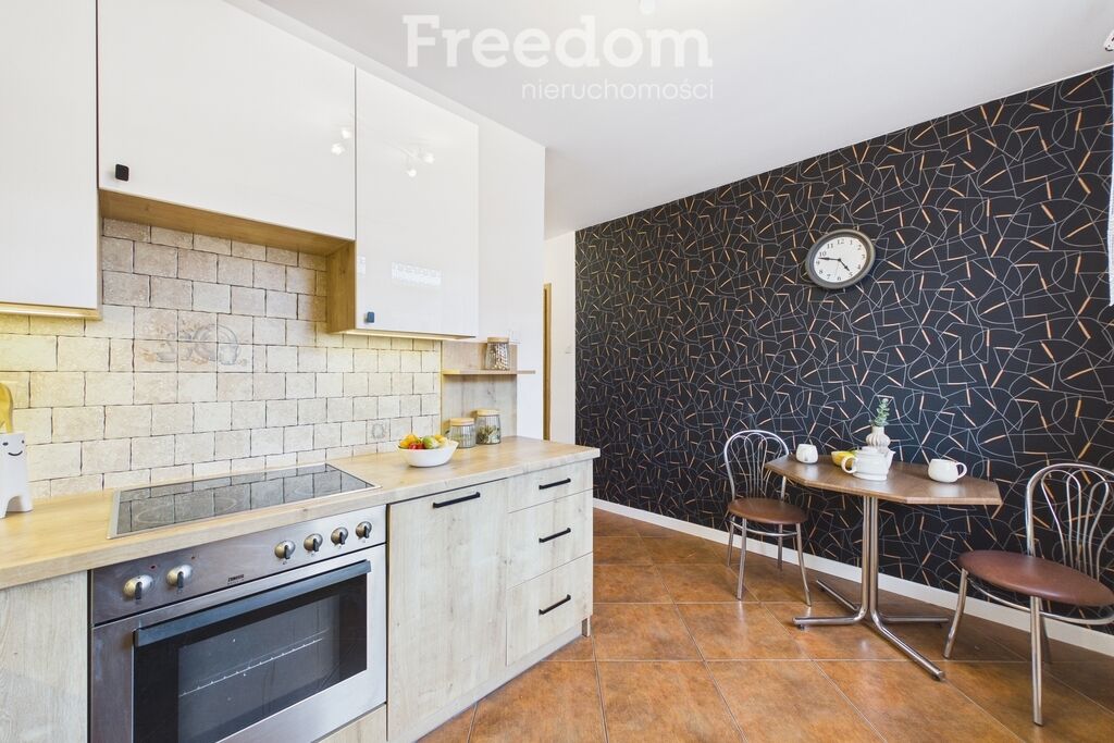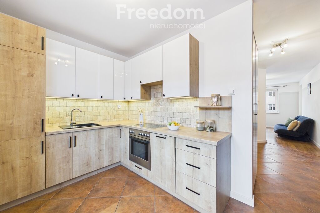 widnej kuchni z nowoczesną zabudową, łazienki oraz przedpokoju. Z