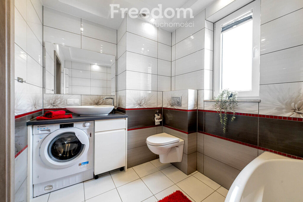 Łazienka z oknem, narożną wanną, umywalką, WC i pralką.