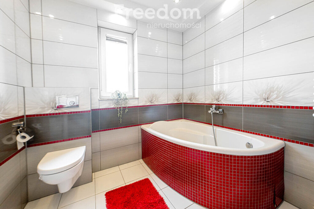 Łazienka z oknem, narożną wanną, umywalką, WC i pralką.