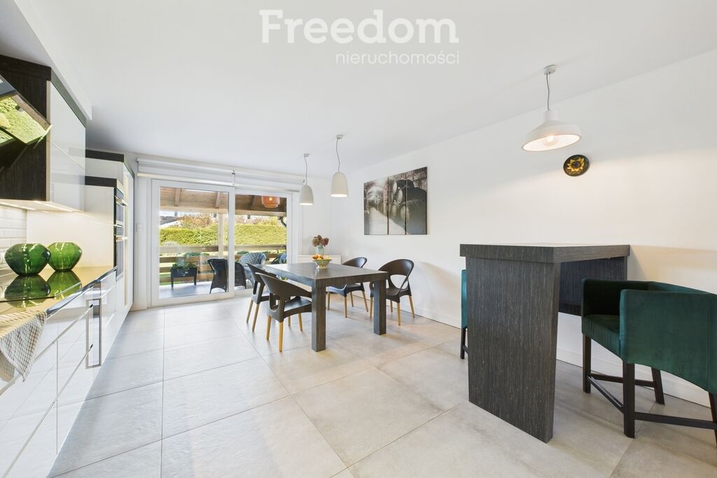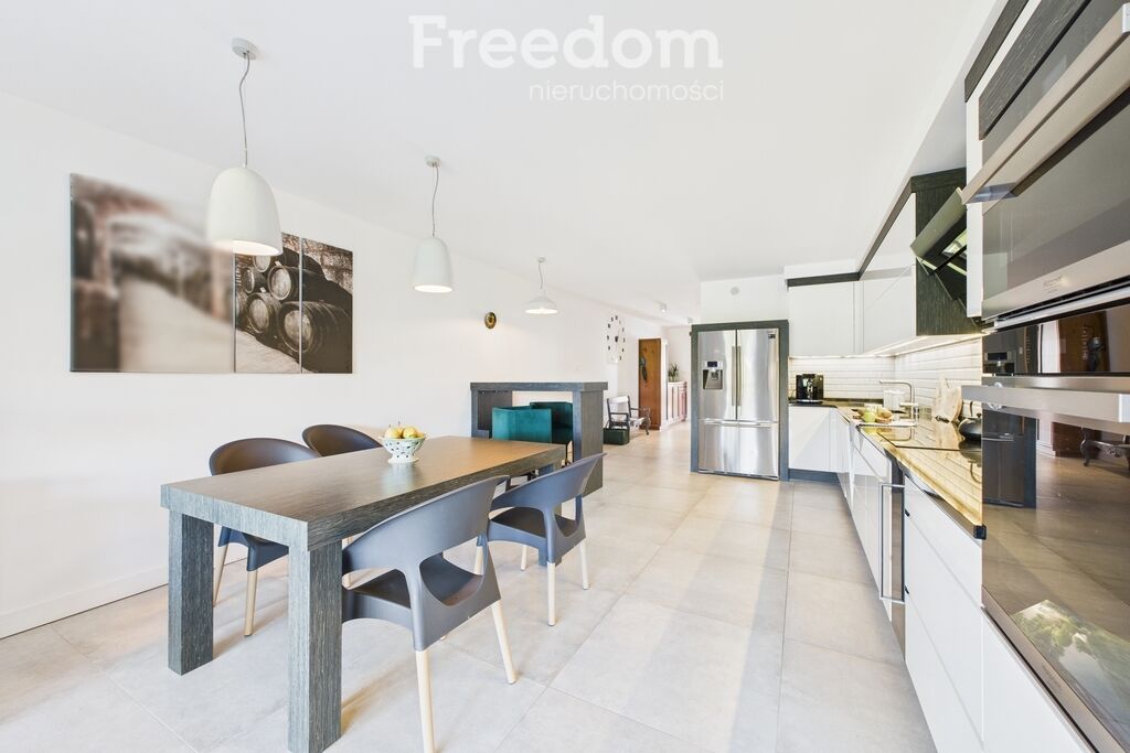 Z salonu przechodzimy do eleganckiej kuchni połączonej z jadalnią.
