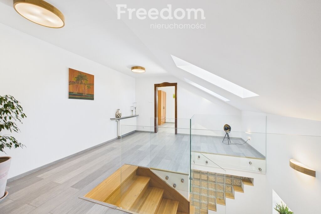 Na piętrze znajduje się przestronny hol z szklaną balustradą i