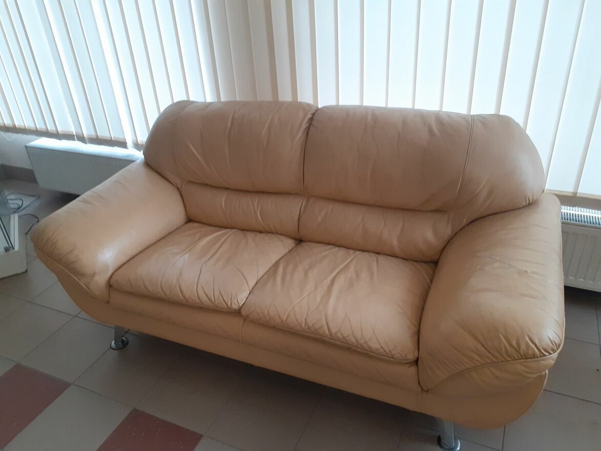 Wygodna, skórzana sofa w kolorze beżowym wraz z fotelem, w dobrym stanie, nadaje się do dalszego użytkowania. Idealna propozycja dla osób poszukujących niedrogiego, ale solidnego mebla do salonu lub innego pomieszczenia. Poza tym witryna przeszklona podświetlana, fotel obrotowy na kółkach i cztery rodzaje krzeseł:sofa dł. 180cm, fotel dł. 125cm - razem 300 zł. ,witryna podświetlana 48x48x183cm - 300 zł., fotel obrotowy - 20zł., krzesła całe drewniane jasne (3 szt.) - po 20 zł, krzesła drewniane ciemne, tapicerowane (2 szt.) - po 20zł., krzesła na stelażu stalowym (bezowe) 4 szt. - po 15 zł, krzesła na stelażu stalowym (szare) , 2 szt. - po 15 zł.