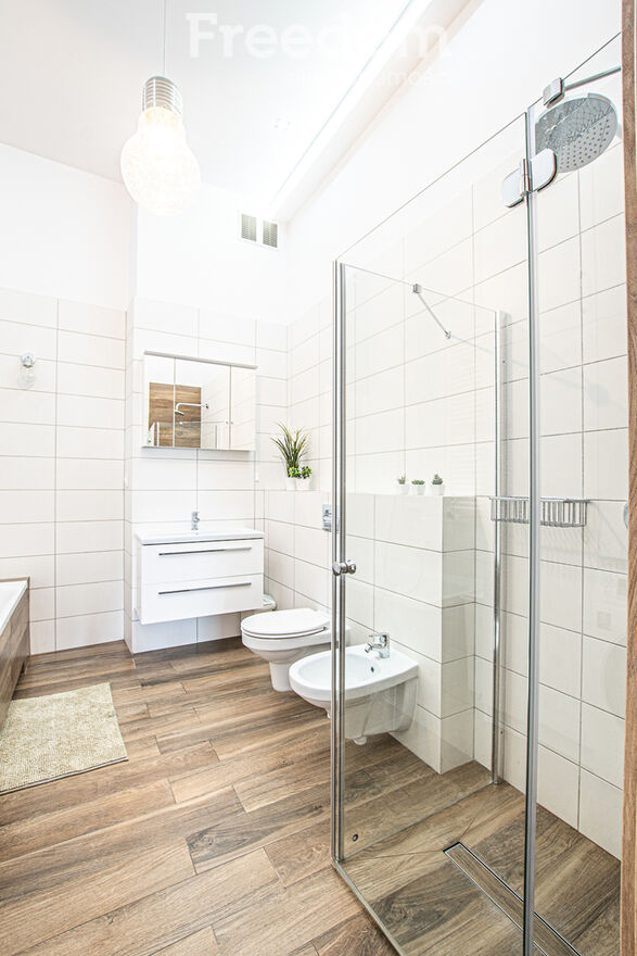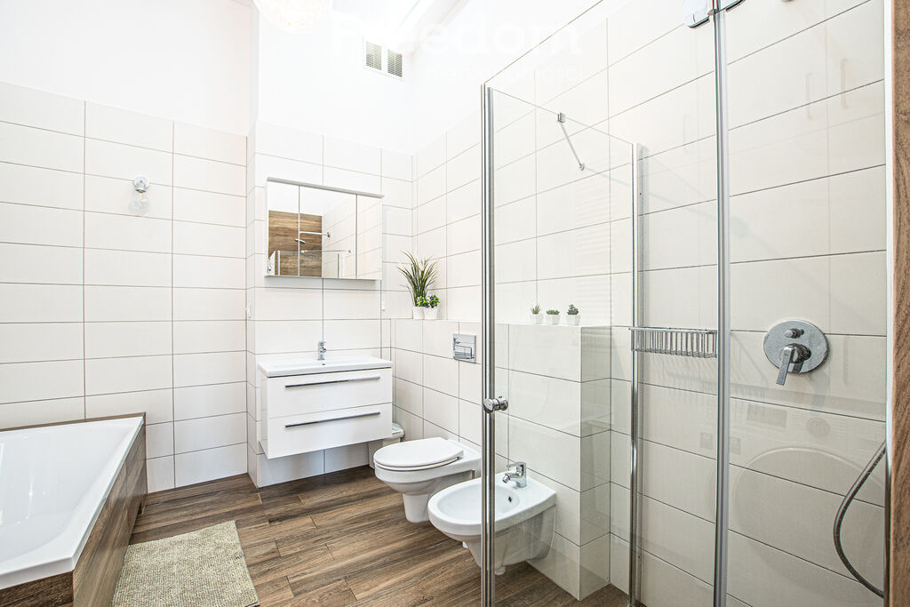 wanną, prysznicem, bidetem oraz wc. Wystawa okien od strony